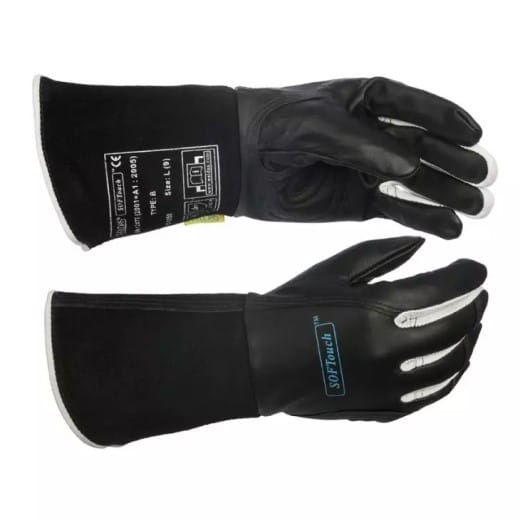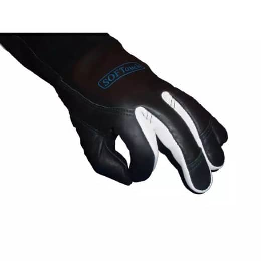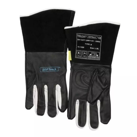 SOFTouch™, schwarzer Glatt, Rindsleder und weissem Ziegenleder allzweck, Hochcomfort Schweißerhandschuh mit eine Stulpe von spalt Rindsleder. Nahtloser Index-Finger zur besseren Führung des WIG-Stabes. Weldas® WIG Handschuhe (10-1003, 10-1005, 10-1009, 10-1050), haben einen ‘nahtlosen’ Zeigefinger. Dies gibt ungehinderte Kontrolle über Schweißelektroden mit einem kleinen Durchmesser und ultra-leichtem WIG-Brenner. Diese Ausführung verhindert das Ausbrennen der Nähte sowie Abrieb.
