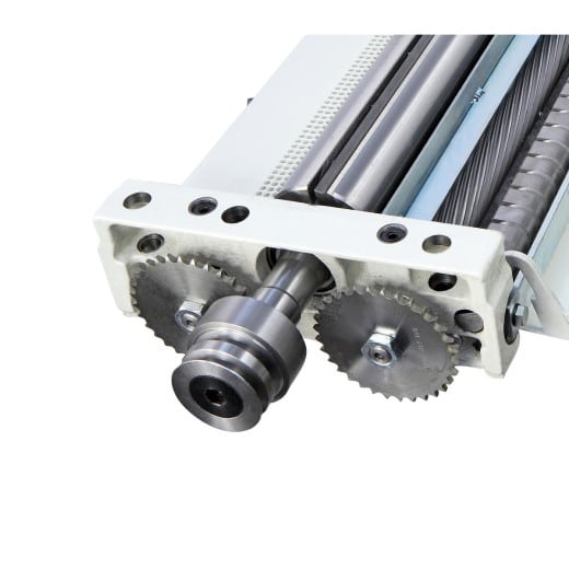 - Schrägverzahnte Stahleinzugswalzen für einen konstanten und gleichmäßigen Materialeinzug ohne Abdrücke