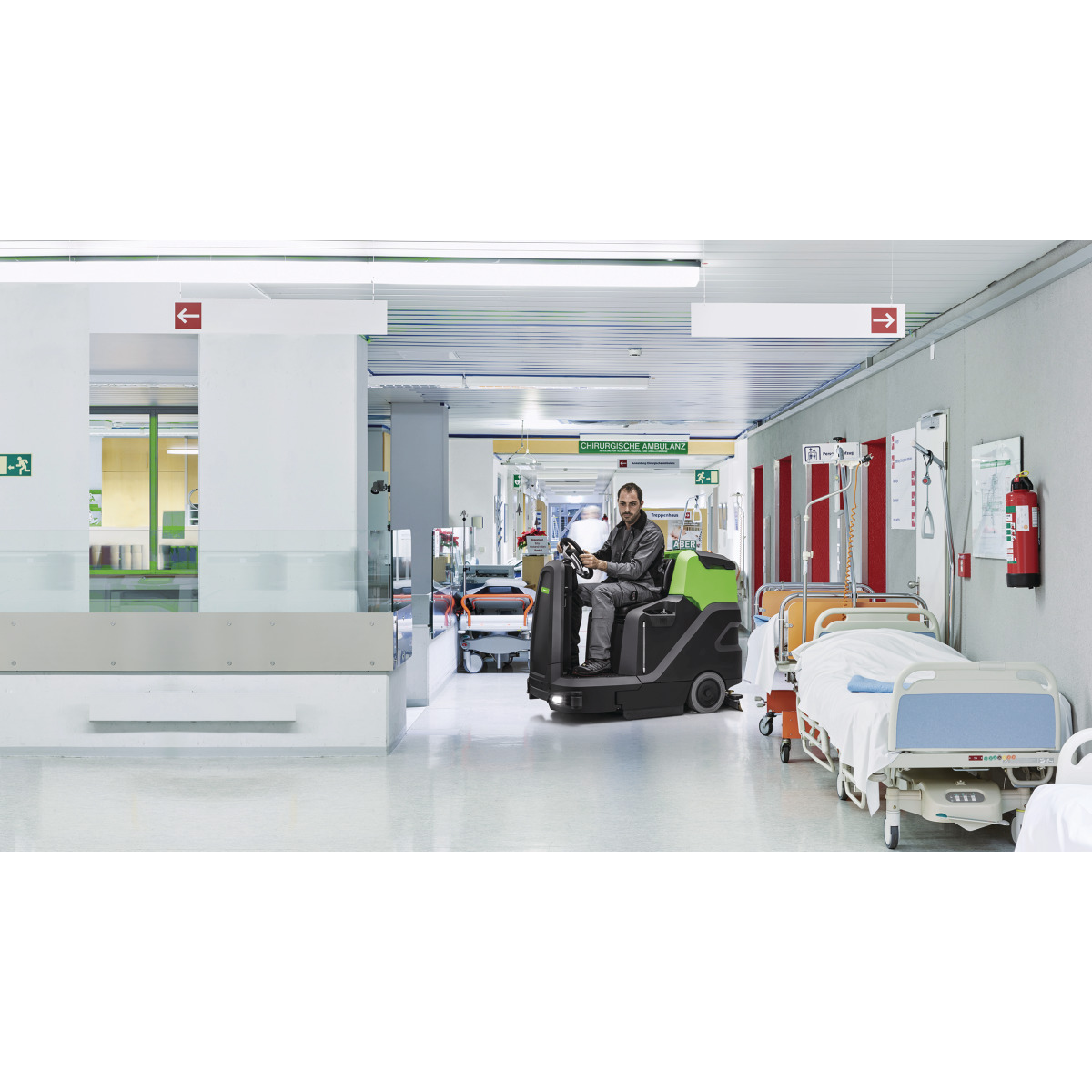 - Batteriebetriebene Aufsitzscheuersaugmaschine mit zwei Zylinderbürsten und zwei seitlichen Kehrbürsten