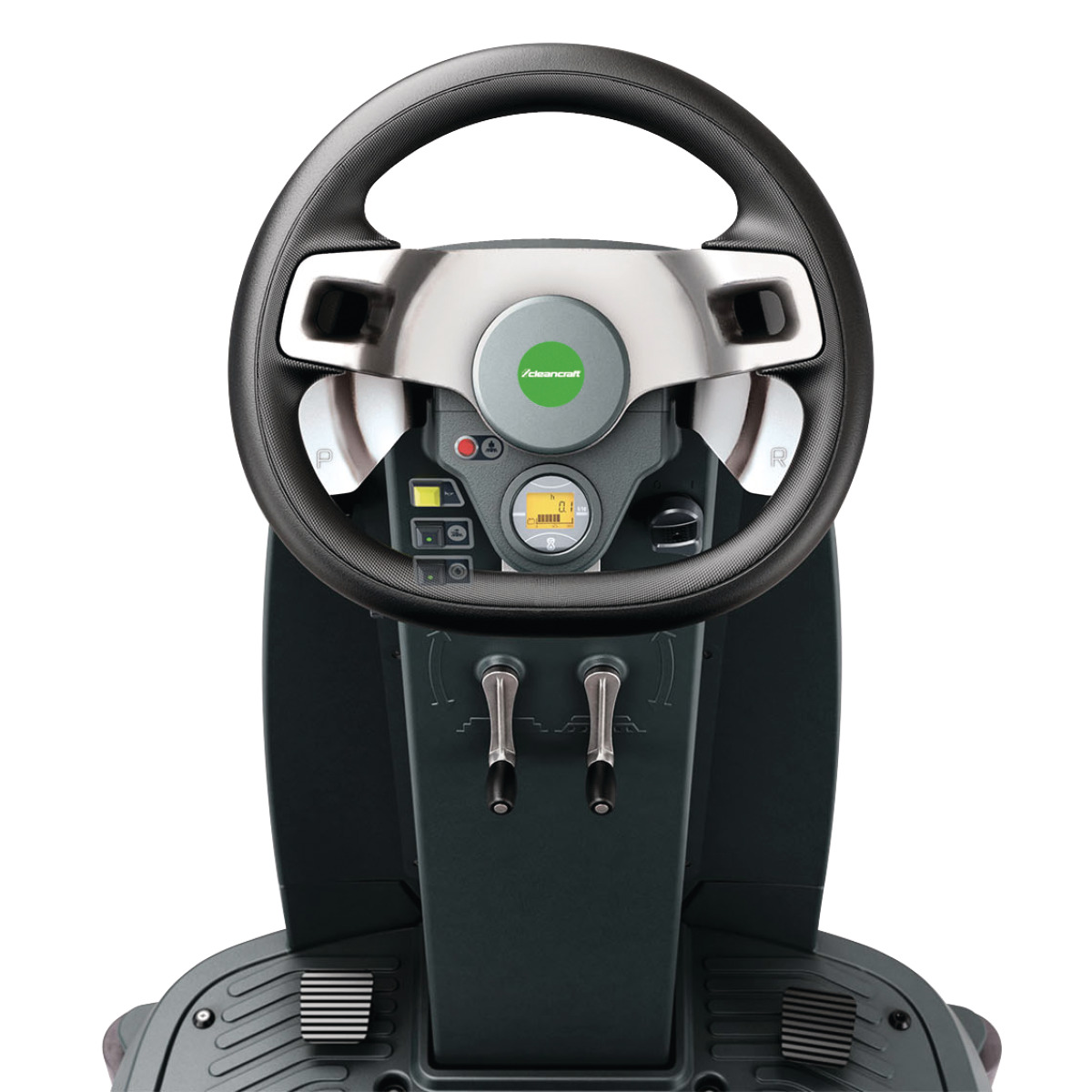 - Lenkrad in der Ausführung mit kleiner Anzeige und Schaltwippen für Arbeitsdruck und Rückwärtsgang
