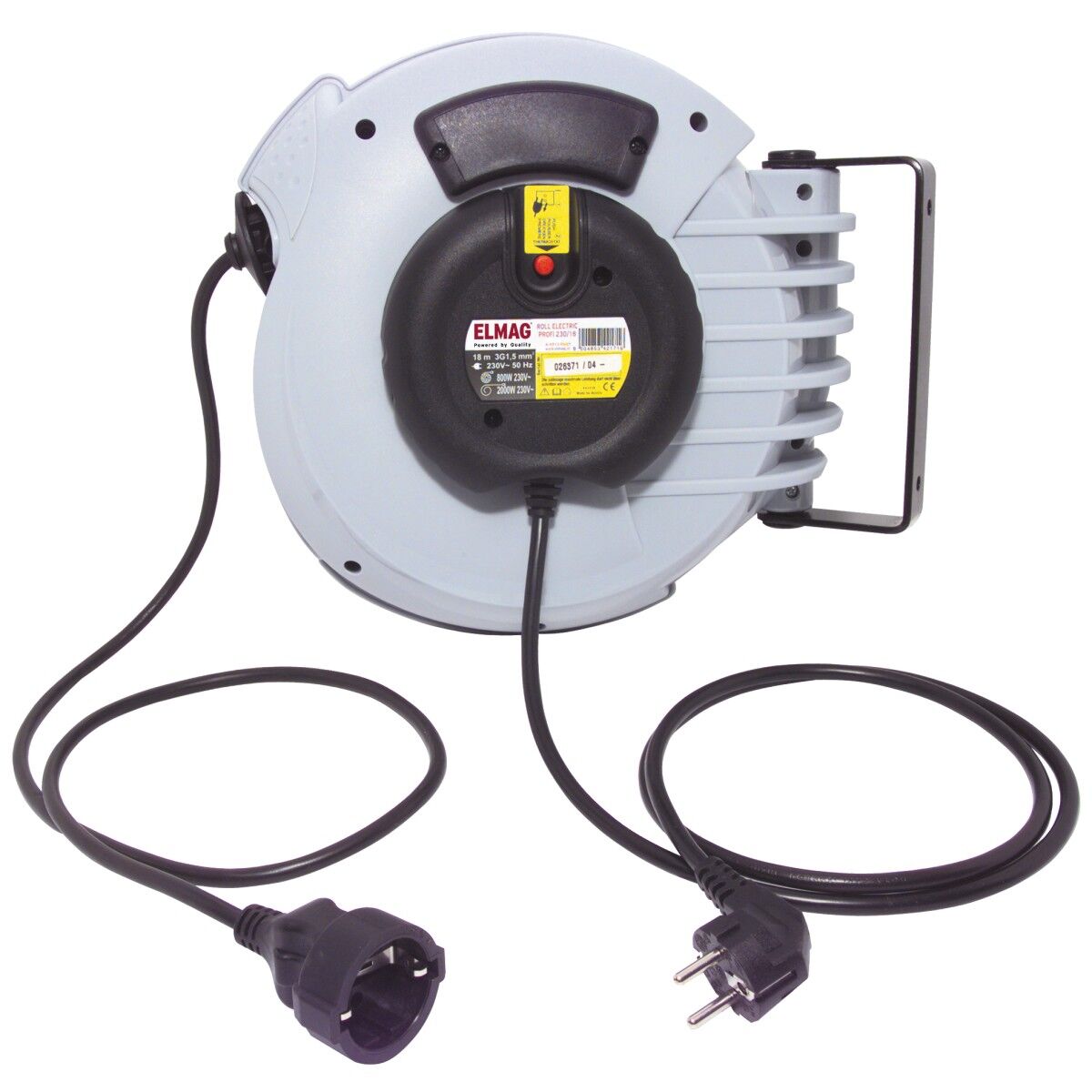 Der ROLL ELECTRIC Kabelaufroller von ELMAG ist der praktische „Unfallschutzbeauftragte“ für Hobby, Landwirtschaft, Gewerbe und Industrie – für aufgeräumte Arbeitsplätze und ein starkes Preis-Leistungs-Verhältnis. TÜV- und GS-geprüft, mit Schuko-Stecker und Steckdose. Das schlagfeste, schwenkbar gelagerte Gehäuse auf stabiler Wand-/Deckenhalterung aus Stahl macht ihn besonders flexibel. Die abschaltbare Blockiervorrichtung hält das Kabel sicher, lösen per kurzem Ziehen. Mit thermischer Überlastsicherung, 230 V, H05VV-F (3 x 1,5 mm²), IP20. Belastbarkeit: 800 W aufgerollt, 2.000 W abgerollt.