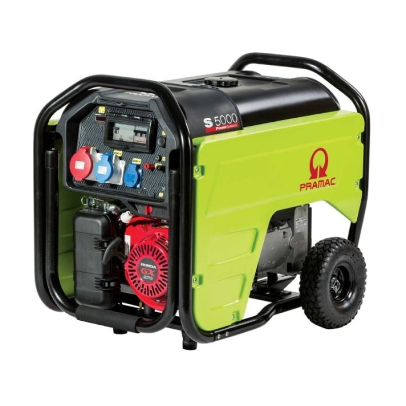 Das Benzinaggregat Pramac S5000 THI ist der Profi unter den Stromerzeugern mit seinem 27 Liter Großtank und dem verstärkten Rahmen. Zur serienmäßigen Ausstattung gehört der Betriebsstundenzähler, Radsatz mit Klappgriffen und dem elektronisch geregelten Generator, kurz AVR-Regler. Somit ist der Stromerzeuger jeder Hausforderung gewachsen. Durch die Isolationsüberwachung (kein Erdungsspieß nötig) ist das Benzinaggregat Pramac S5000THI bestens geeignet für die Baustelle. Die Steckdosen 230V / 400V mit Schutzart IP44 sind mit thermomagnetischen Schutzschaltern gesichert. Der Stromerzeuger ist mit einem Honda Motor GX270 ausgestattet, welcher über einen Seilzug gestartet wird. Durch die Ölmangel-Abschaltautomatik wird der Motor vor einem zu geringen Ölstand geschützt. Stromerzeuger mit AVR-Regler (elektronischer Spannungsregelung) sind für empfindliche Verbraucher wie die Hausnotstromversorgung, Inverterschweißgeräte und elektronisch gesteuerte Elektrowerkzeuge besonders geeignet. Nützliche Optionen wie Abgasschlauch und Verlängerungskabel runden unser Angebot ab.
