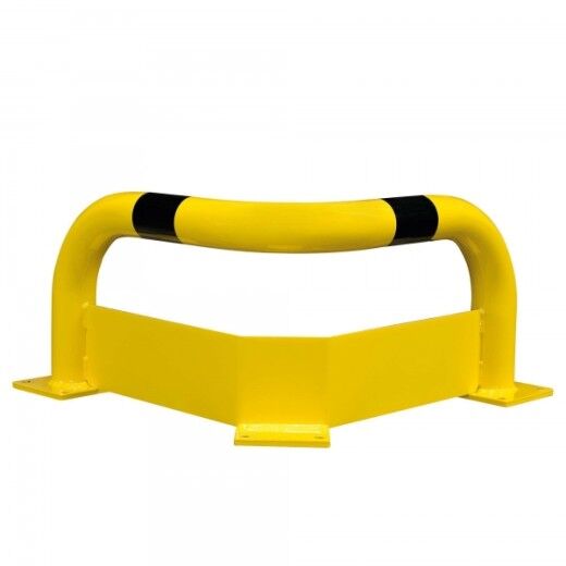 Hoch belastbarer ECK-Schutzbügel aus Gütestahl mit integriertem Unterfahrschutz. Verhindert das gefährliche Einfädeln der Staplergabeln in Regalbereiche oder andere schützenswerte Einrichtungen. Identisch mit Rammschutz-Bügeln für den Inneneinsatz, jedoch zusätzlich mit 4 mm starker Stahlplatte.