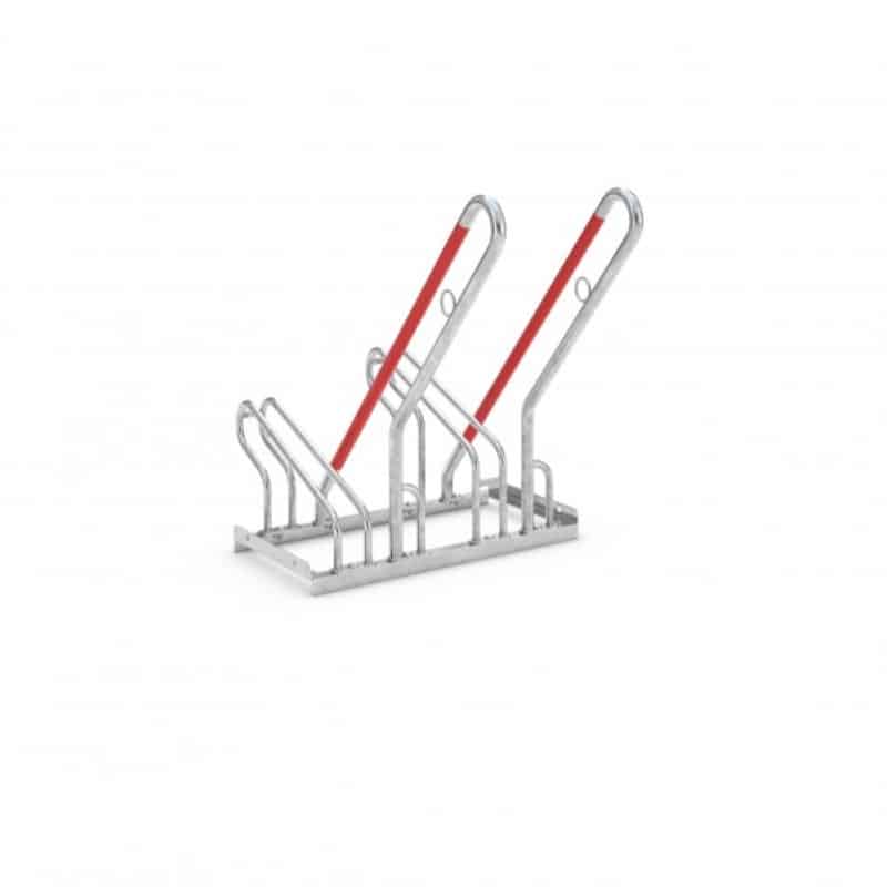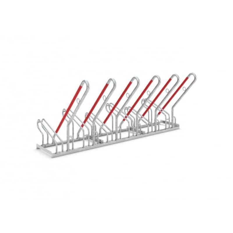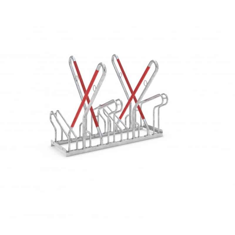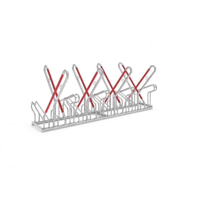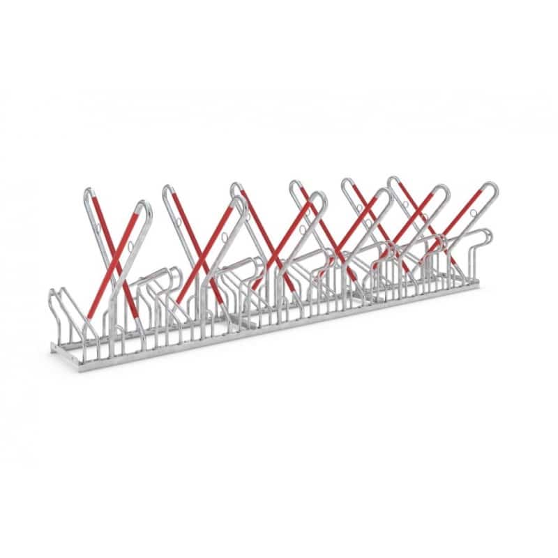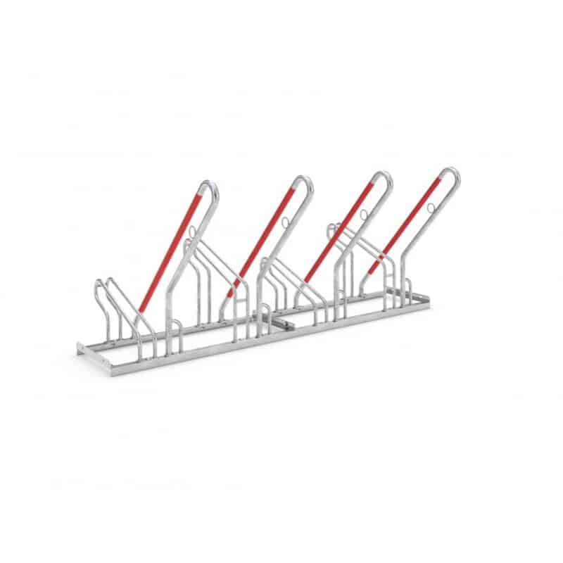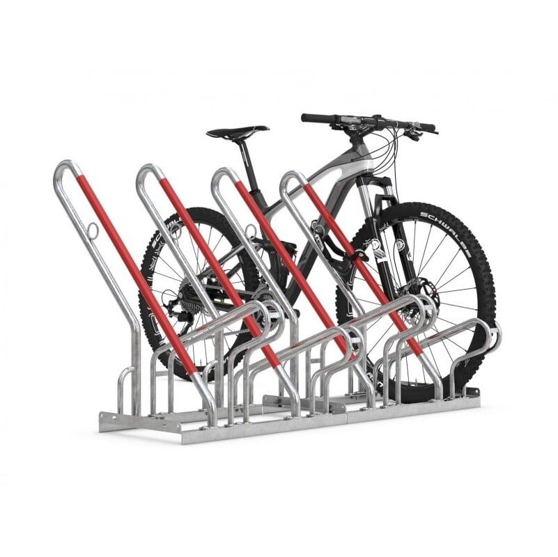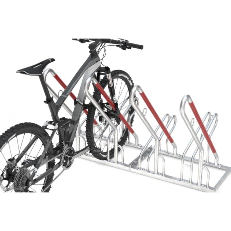 Unsere Fahrradständer mit Bügel zum Anlehnen bieten zudem eine optimierte Diebstahlsicherung und einen Anschlagschutz in Signalfarbe Rot, um Folgeschäden an den Felgen zu vermeiden. Die Möglichkeit, Schlosssysteme an den integrierten Stahl-Rundösen zu sichern, sorgt für eine zusätzliche Sicherheit. Die Tief-/Hocheinstellung mit einer Höhendifferenz von 90 mm bei einem Radabstand von 350 mm erlaubt ein platzsparendes Parken und der Bügelabstand eignet sich für Fahrräder mit Reifenbreiten bis 55 mm.
