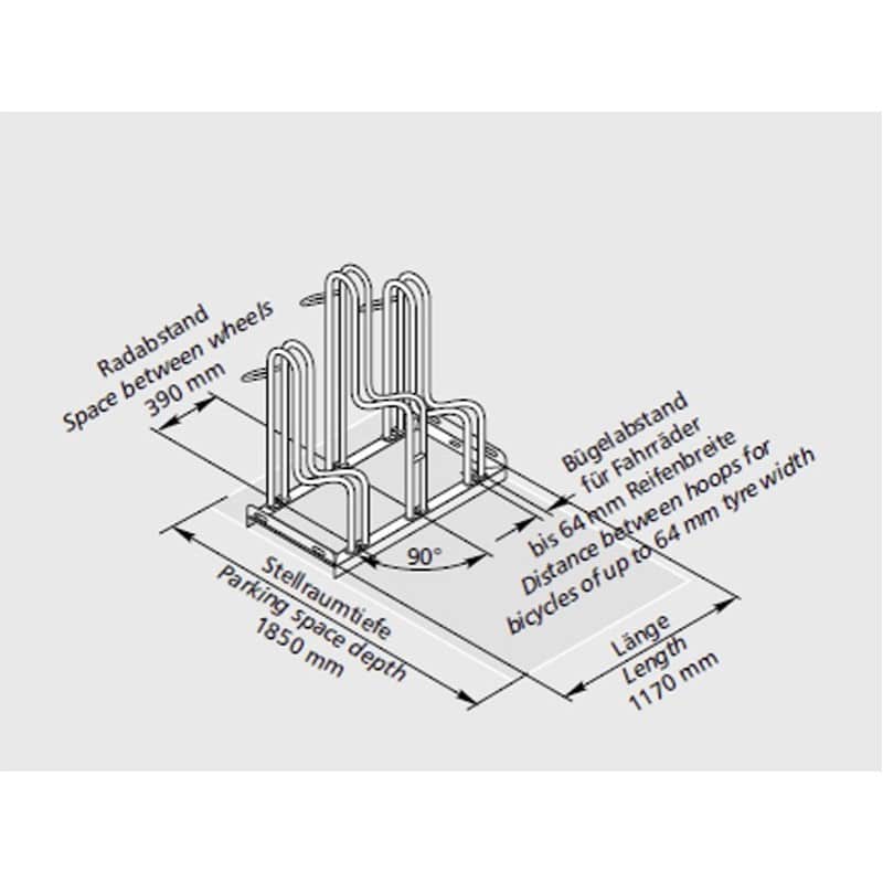 Die Stellraumtiefe beträgt bei einseitiger Radeinstellung etwa 1.850 mm, was für eine optimale Platznutzung sorgt. Mit der Möglichkeit des höhenversetzten Einparkens kann wertvoller Platz gespart werden. Die Fahrradparkanlage lässt sich einfach und schnell per Paketdienst liefern und selbst montieren. Optional sind Bodenanker und Bodenmontage-Winkel als Zubehör erhältlich.