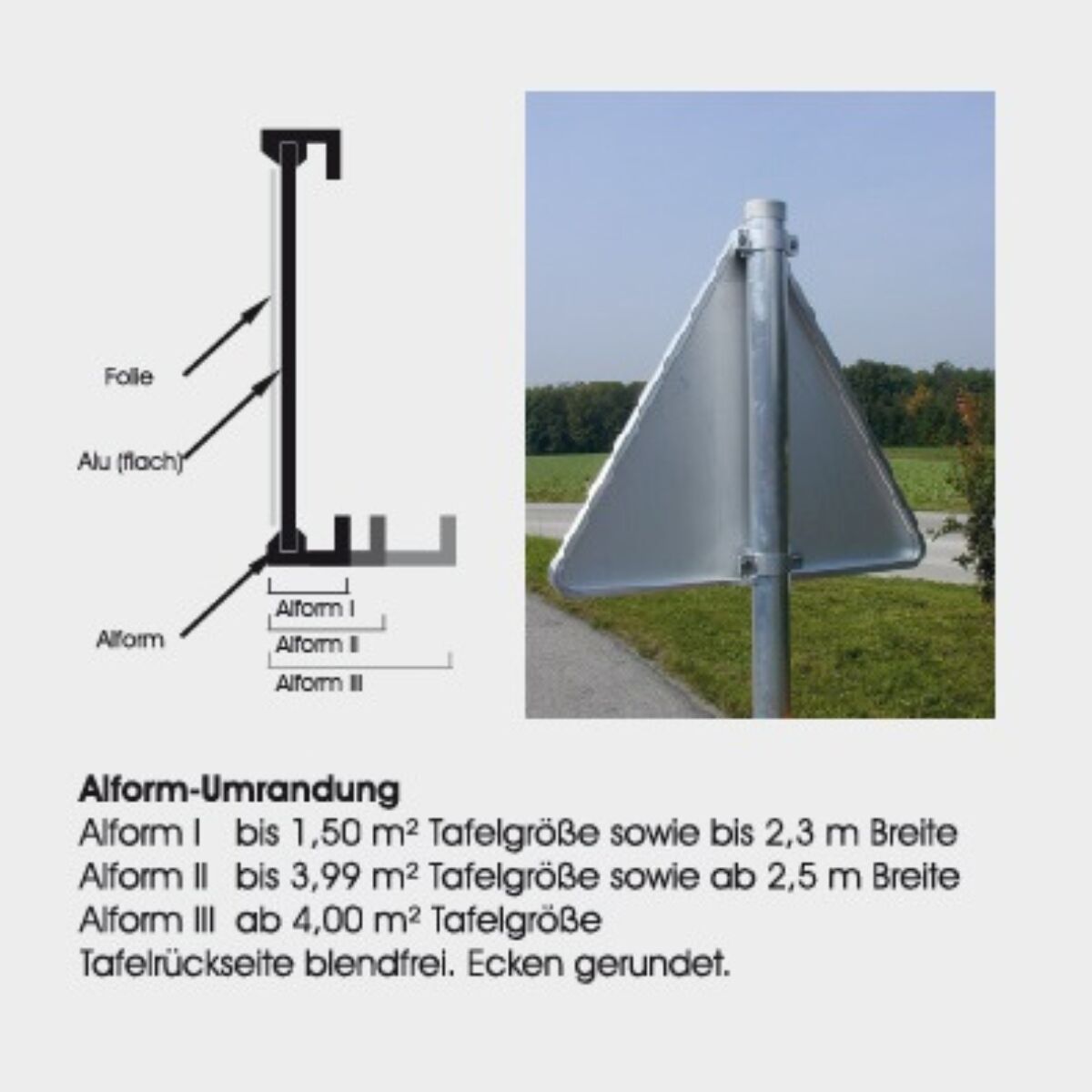 Unsere Verkehrszeichen sind in drei Bauformen erhältlich: Flach, Alform (I–III) und C-Sign.