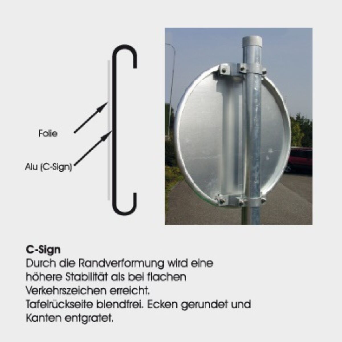 Beim C-Sign wird die Tafel selbst umlaufend abgekantet (Randverformung) und anschließend mit der Folie versehen. Diese Bauform bietet durch die direkte Profilierung des Schildkörpers eine hohe Formstabilität und eignet sich besonders für anspruchsvolle Einsatzbedingungen.