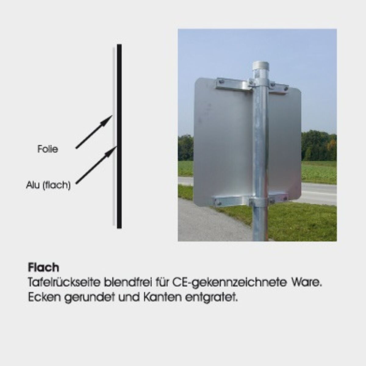 Die flache Ausführung ist die einfachste Variante. Sie besteht aus einer ebenen Tafel ohne Kantung oder weitere Formgebung und eignet sich für Standardanwendungen.
