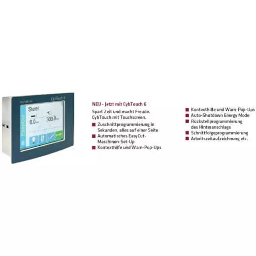 Eine neue Welt der Zuschnittprogrammierung tut sich mit der serienmäßig integrierten CybTouch-Steuerung auf. Am farbig hochauflösenden Touchscreen geht alles in Sekunden. Ein Tastendruck für das Set-Up der Maschine genügt, Blech einschieben, Starttaste drücken – und der Blechabschnitt fällt.