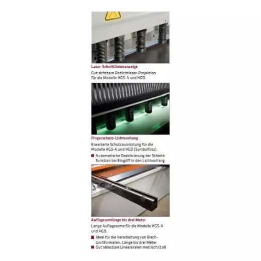 Die hydraulisch angetriebenen HGS-A Schwingschnittscheren schneiden kraftvoll durch alle Blechdicken bis 6,0- bzw. 8,0 mm. Ihre superharten, präzisionsgeschliffenen Spezialstahlmesser hinterlassen stets ein sauberes, gerades Schnittbild.