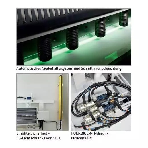 - Automatisches Niederhaltersystem mit hoher Haltekraft für Auflage- und Kippsicherheit während der Schnittphase