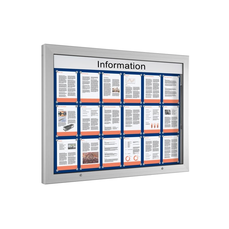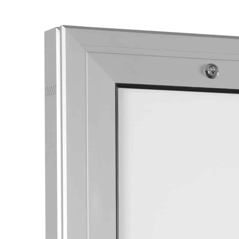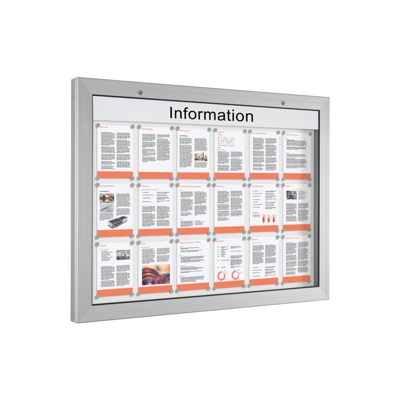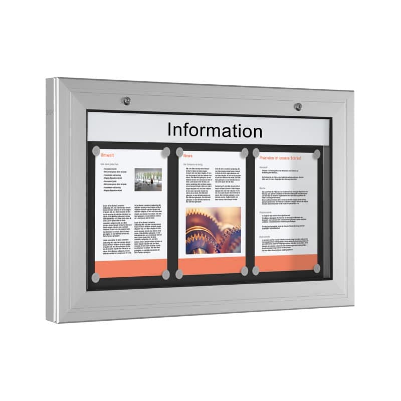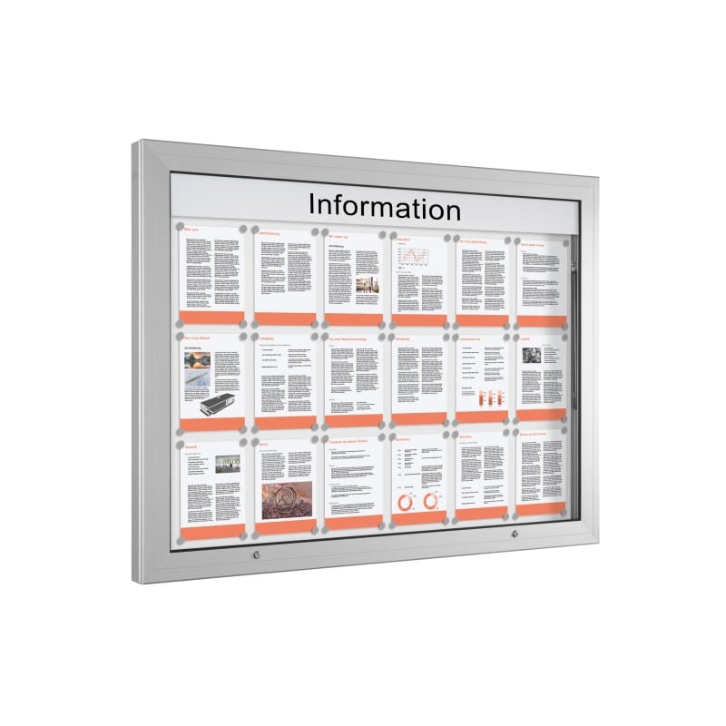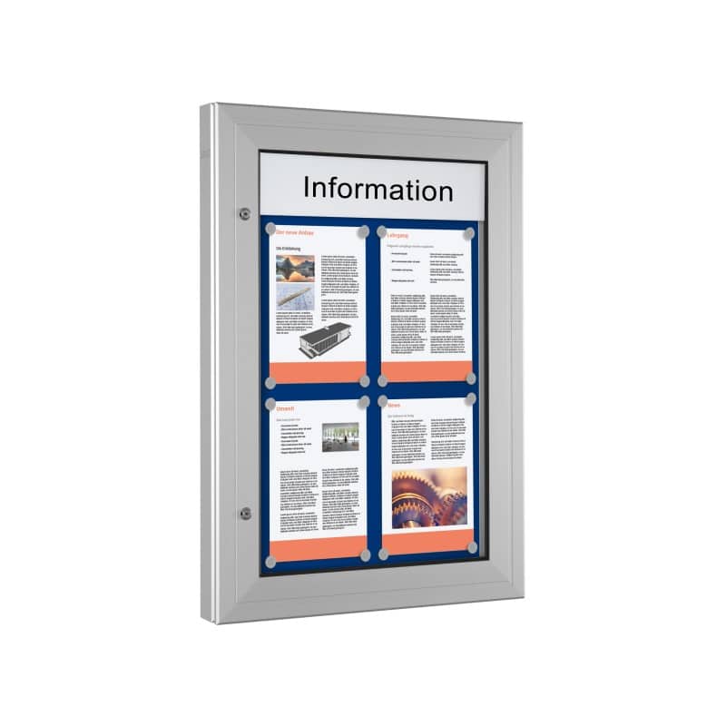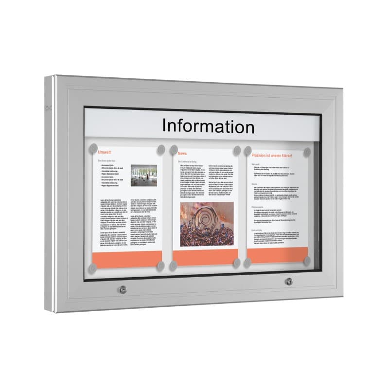 Der Kantline-Schaukasten ist der klassische Schaukasten für den Außenbereich aus silberfarbig eloxiertem Aluminium und besticht durch das breite, kantige Design und höchste Qualität. Der Flügel schließt bündig mit dem Rahmen ab. Der abschließbare Schaukasten ist vielseitig einsetzbar, ein markanter Klassiker, der jedem Wetter standhält und Informationen, Poster und Aushänge ansprechend präsentiert.