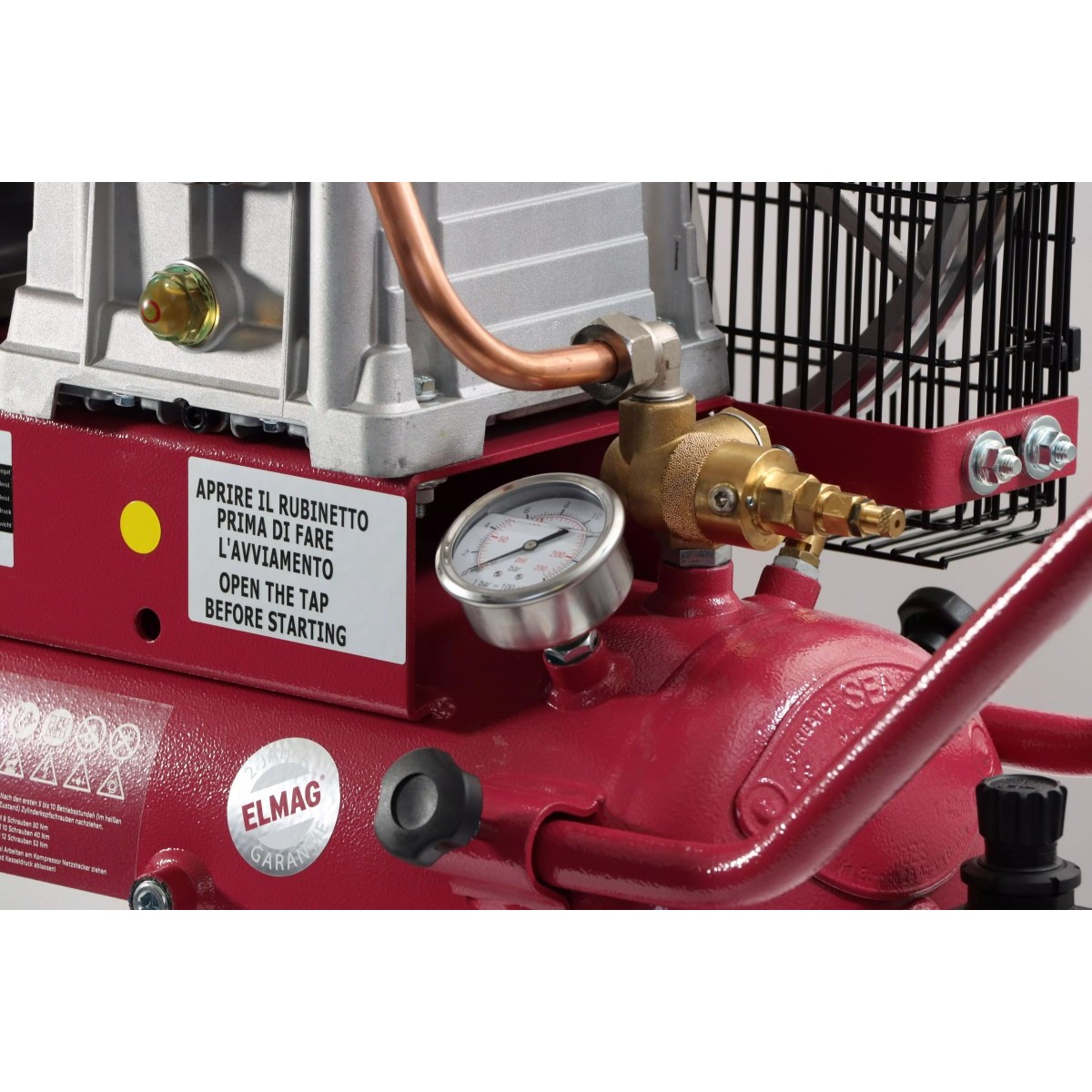 - Serienausstattung: Glycerin-Manometer, Sicherheitsventil, Rückschlagventil kombiniert mit Last-Leerlauf-Regelung, Filter-Druckregler, Sicherheits-Entlüftungskupplung, Vollgummi-Räder Ø 250 mm,