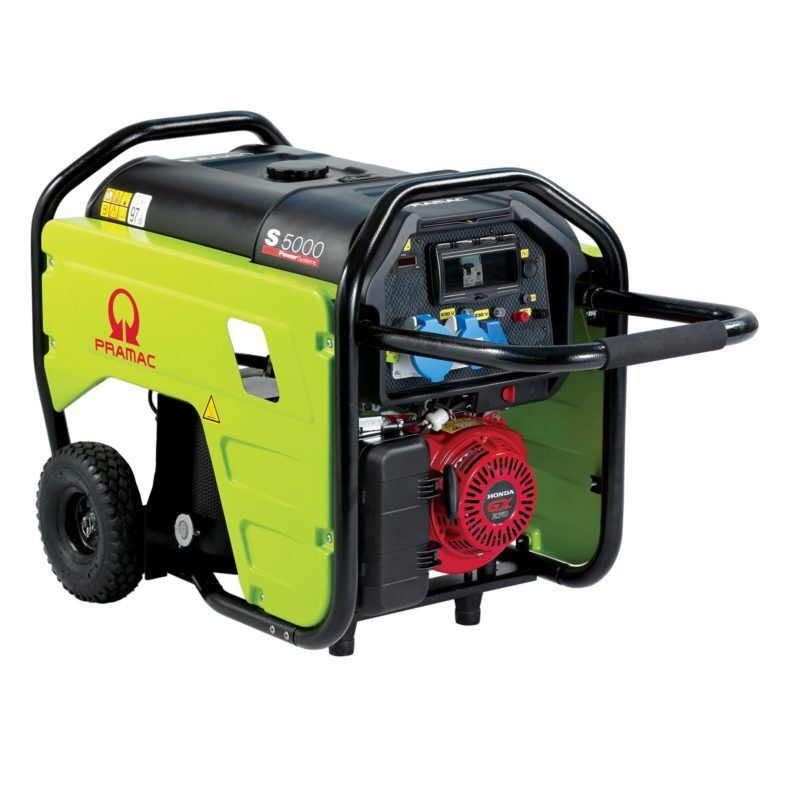 Der Stromerzeuger Pramac S5000 SHI ist der Profi unter den Stromerzeugern mit seinem 27 Liter Großtank und dem verstärkten Rahmen. Zur serienmäßigen Ausstattung gehört der Betriebsstundenzähler, Radsatz mit einem rutschfesten Klappgriff und dem elektronisch geregelten Generator, kurz AVR-Regler. Somit ist der Strom Aggregator jeder Hausforderung gewachsen. Durch die Isolationsüberwachung (kein Erdungsspieß nötig) ist der Stromerzeuger Pramac S5000SHI bestens geeignet für die Baustelle. Die Steckdosen 230V mit Schutzart IP44 sind mit thermomagnetischen Schutzschaltern gesichert. Der Stromerzeuger ist mit einem Honda Motor GX270 ausgestattet, welcher über einen Seilzug gestartet wird. Durch die Ölmangel-Abschaltautomatik wird der Motor vor einem zu geringen Ölstand geschützt. Stromerzeuger mit AVR-Regler (elektronischer Spannungsregelung) sind für empfindliche Verbraucher wie die Hausnotstromversorgung, Inverterschweißgeräte und elektronisch gesteuerte Elektrowerkzeuge besonders geeignet. Nützliche Optionen wie Abgasschlauch und Verlängerungskabel runden unser Angebot ab.