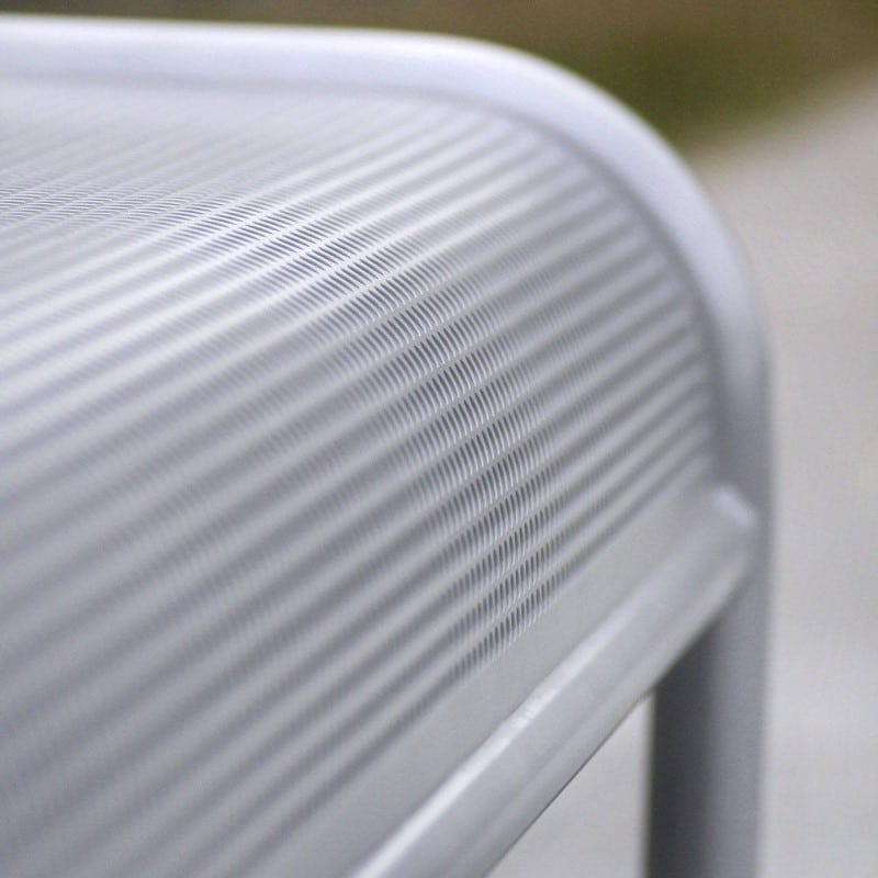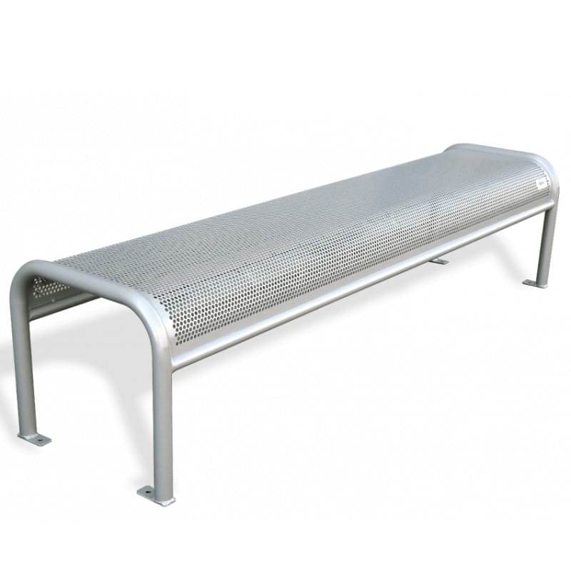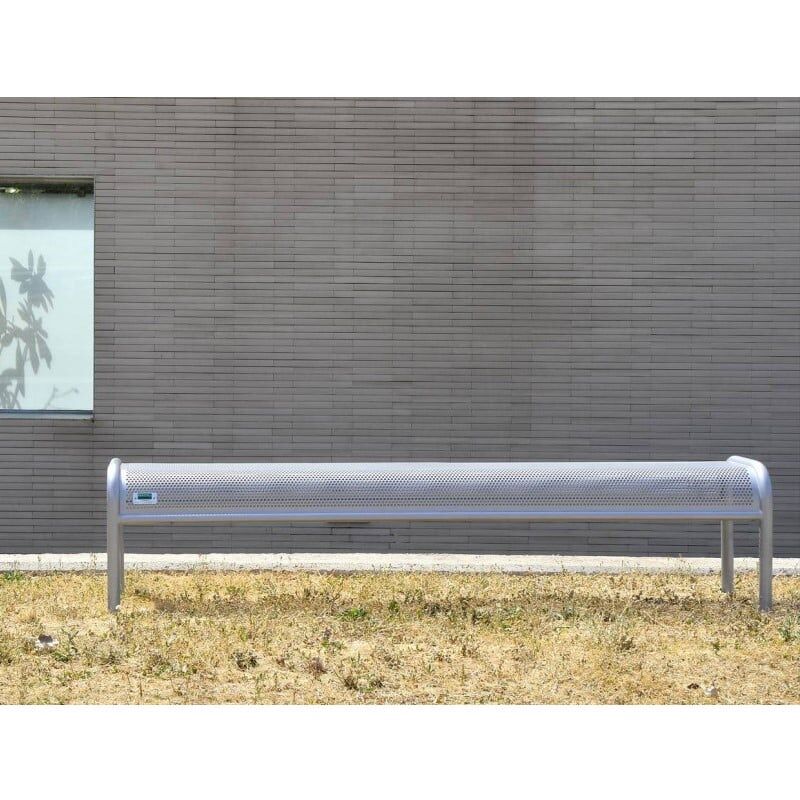 Die Bank besteht aus einem 40 mm starken Stahlrohr und ist mit einer Sitz- und Lehnefläche aus perforierter Stahlplatte in 2mm Stärke sowie 7 mm Bohrungen ausgestattet. Zur optimalen Korrosionsschutz wurde die Bank Ferrus behandelt. Dieser Prozess besteht aus drei Schichten, die nach dem Entfernen aller Unreinheiten durch Kugelstrahlen aufgetragen werden. Zuerst wird Verzinkung aufgetragen, gefolgt von einem Epoxyd-Primer und schließlich der Polyester-Pulverbeschichtung in RAL 9006.