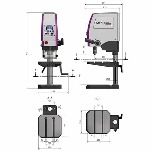 - Abstand Bohrfutter – Bohrtisch max. 315 mm