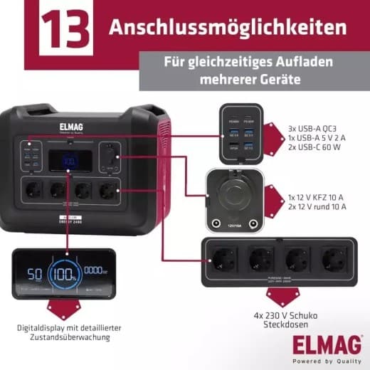 - Umfangreiche Anschlussmöglichkeiten: Schuko 12V DC, USB-A, USB-C usw.