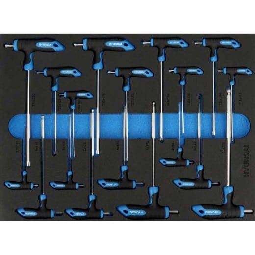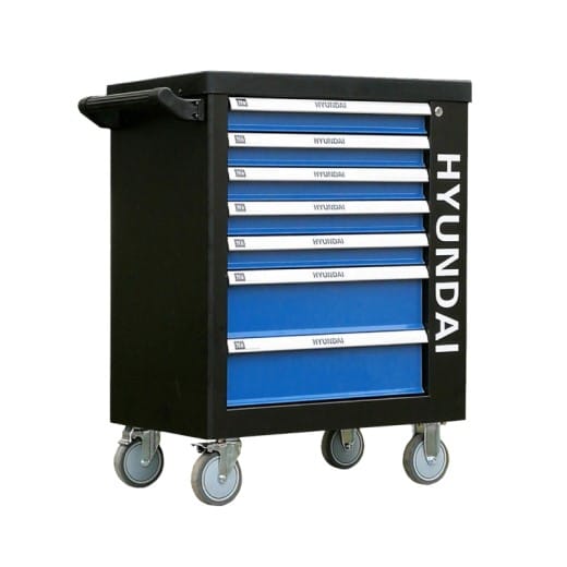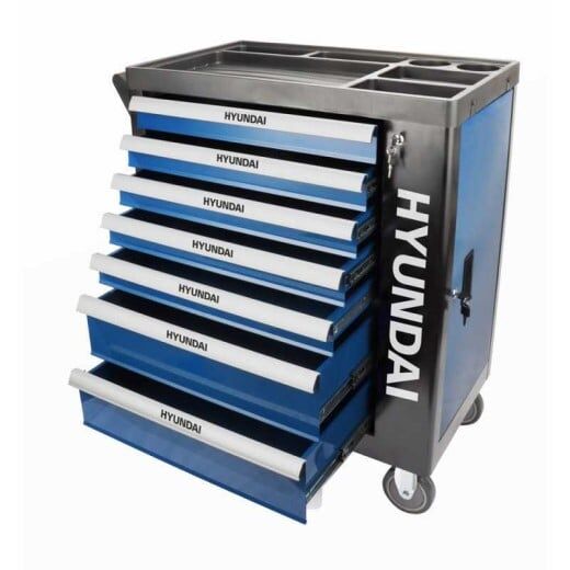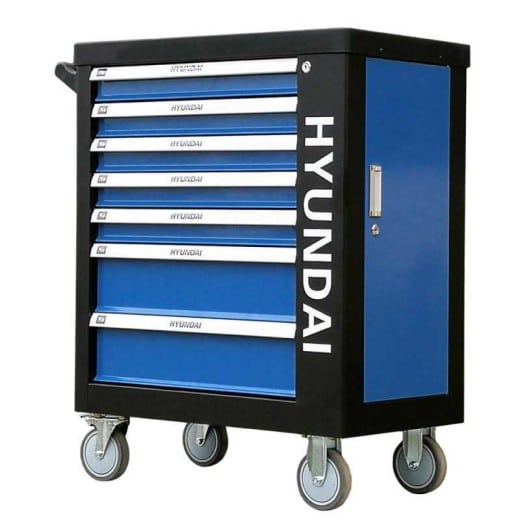 Der HYUNDAI Werkstattwagen ist aus einem stabilen, pulverbeschichteten Stahl hergestellt. Die voll ausziehbaren Schubladen sind kugelgelagert und zentral abschließbar. Das Werkzeug ist durch Schaumstoffeinlagen anwendungsfreundlich strukturiert, so dass man stets einen guten Überblick behält. Der Wagen lässt sich am integrierten Griff leicht rollen. Massivräder lassen sich mit einer Feststellbremse einfach fixieren.