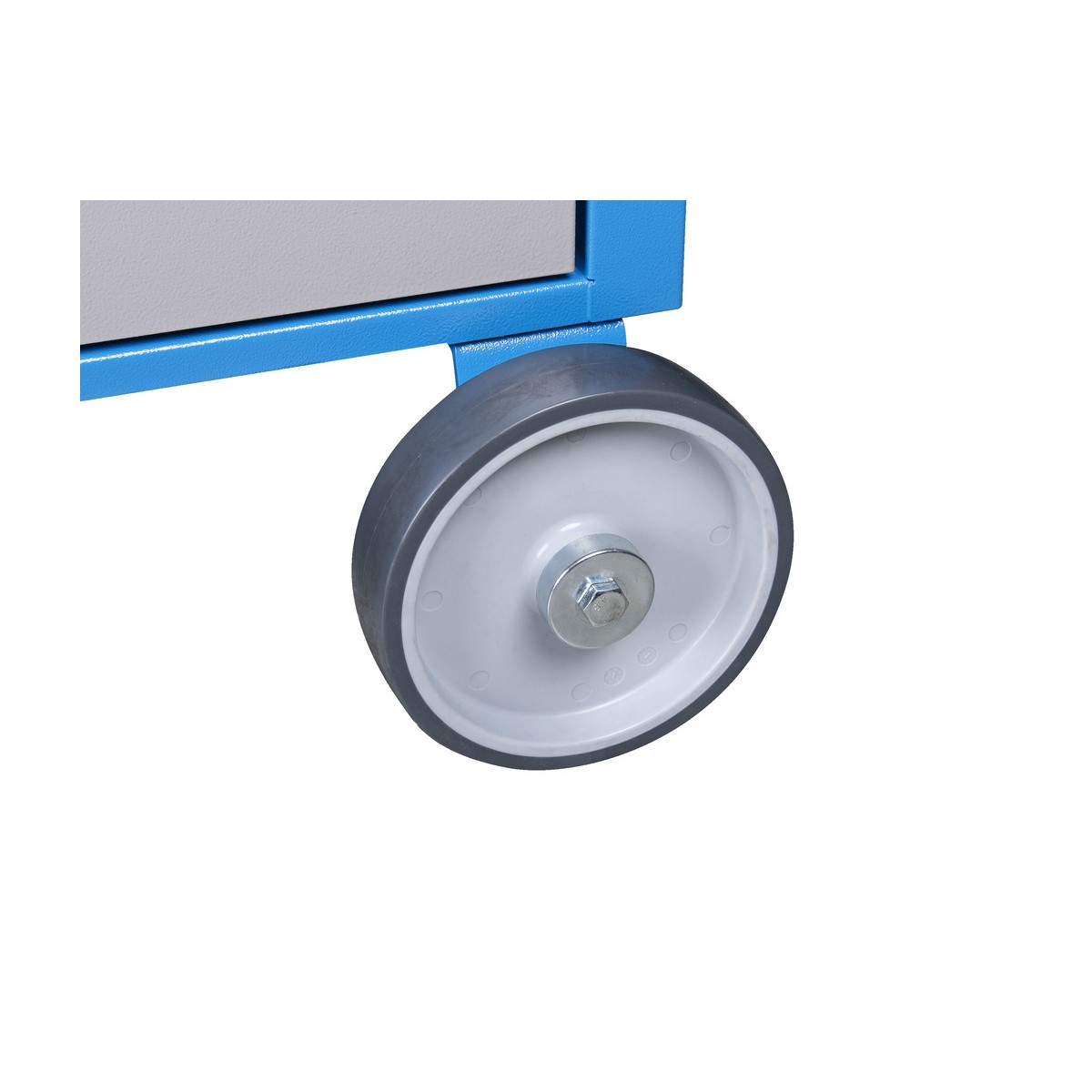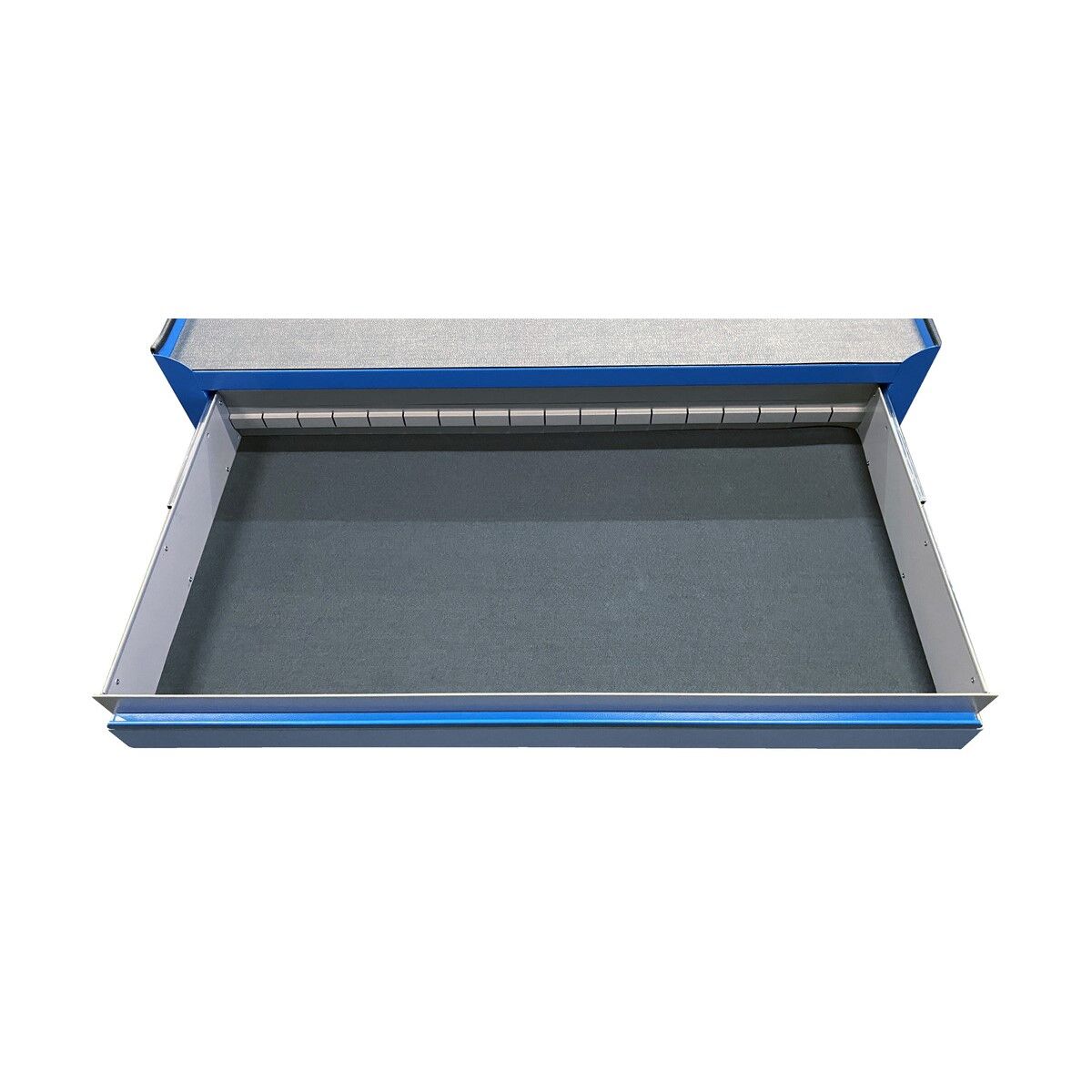 - Die hochgezogene oberste Schublade nimmt alle und auch lange Einsätze in senkrechter Stellung auf. Dadurch wird der Platz besonders gut genutzt und es lassen sich im Gegensatz zu flachen Laden mehr Werkzeuge unterbringen. Es sind auch alle größeren Werzeuge bis 110 mm Höhe aufrecht lagerbar.