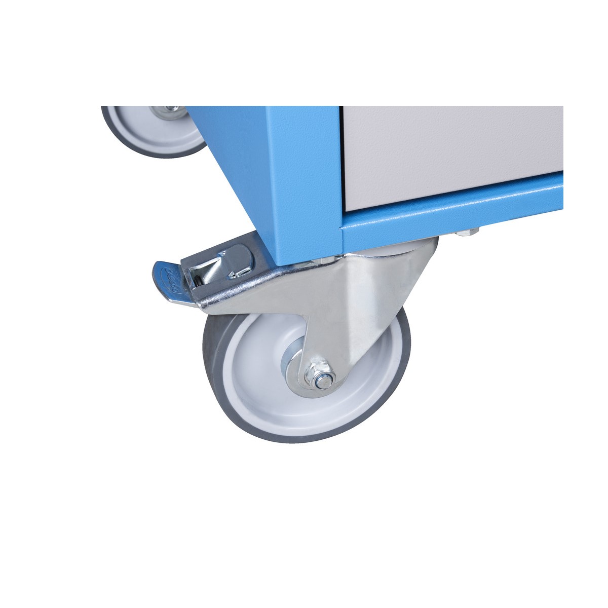 - Öl- und säurebeständige Rollen DM 160 mm, 2 brems- und drehfeststellbar, sowie feststehende Rollen DM 200 mm