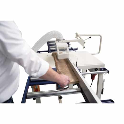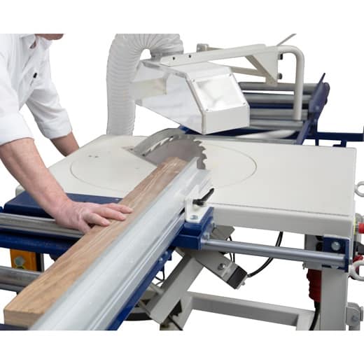 - Führung des Sägeaggregats für Kappschnitte von unten nach oben über einen Hebel